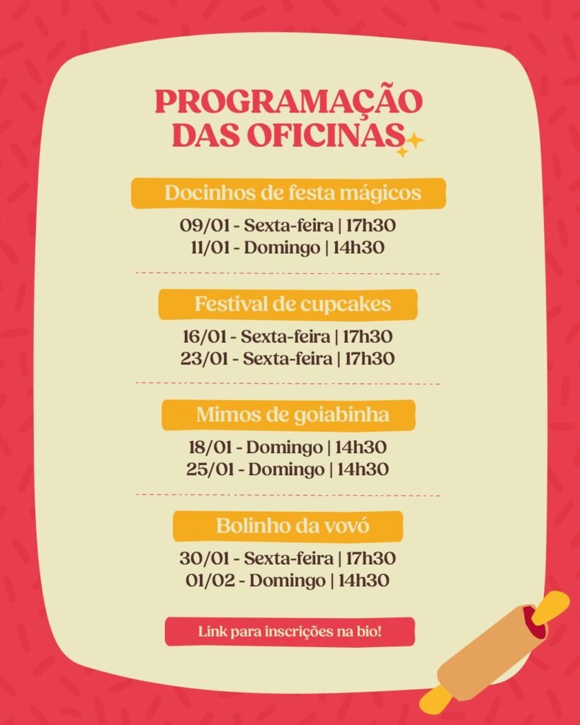 As oficinas são destinadas a crianças a partir de 6 anos, sempre acompanhadas por um responsável durante toda a atividade. Cada oficina conta com 9 vagas, considerando a participação conjunta de 1 criança + 1 adulto, preenchidas conforme a ordem de inscrição.