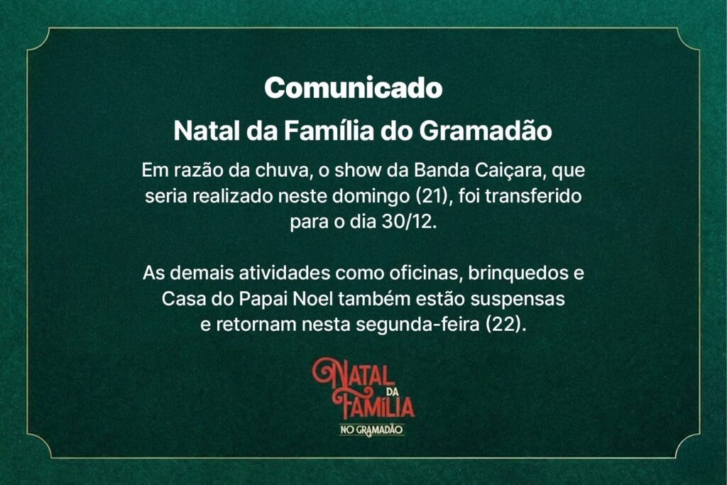 Chuva adia show do Natal da Família no Gramadão deste domingo (21)
