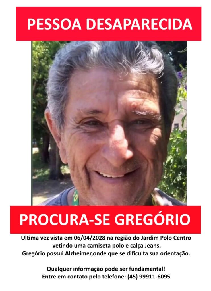 Idoso com Alzheimer está desaparecido desde segunda-feira em Foz; família pede ajuda Um idoso identificado como Gregório, diagnosticado com Alzheimer, está desaparecido desde a tarde de segunda-feira (6 de abril), em Foz do Iguaçu. A família e voluntários intensificam as buscas e pedem apoio da comunidade, especialmente de moradores da região da Vila A, Jardim […]
