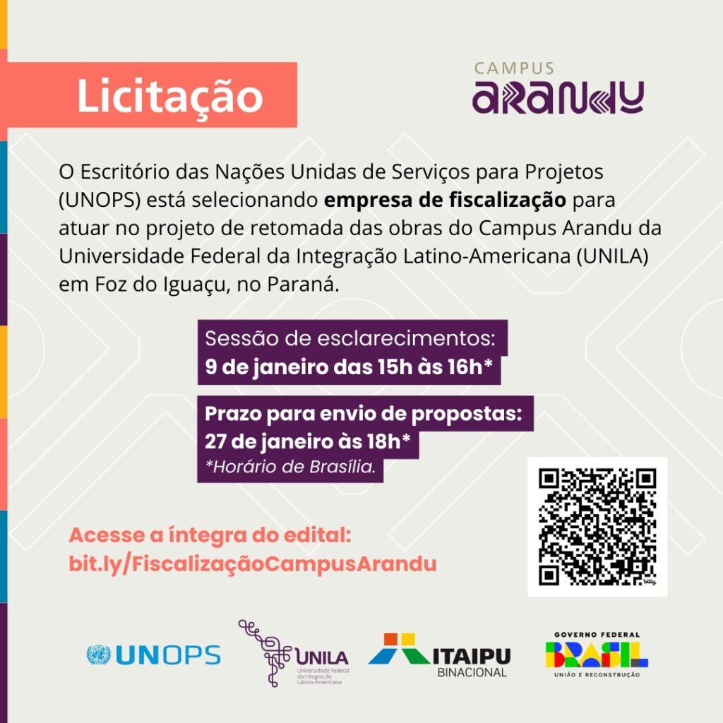 O Escritório das Nações Unidas de Serviços para Projetos (UNOPS), organismo da ONU especializado em infraestrutura, publicou no dia 20 de dezembro o edital de licitação para contratação da empresa responsável pela fiscalização das obras do novo Campus Arandu da Universidade Federal da Integração Latino-Americana (Unila), em Foz do Iguaçu, no Paraná. O projeto é de autoria do renomado arquiteto Oscar Niemeyer.